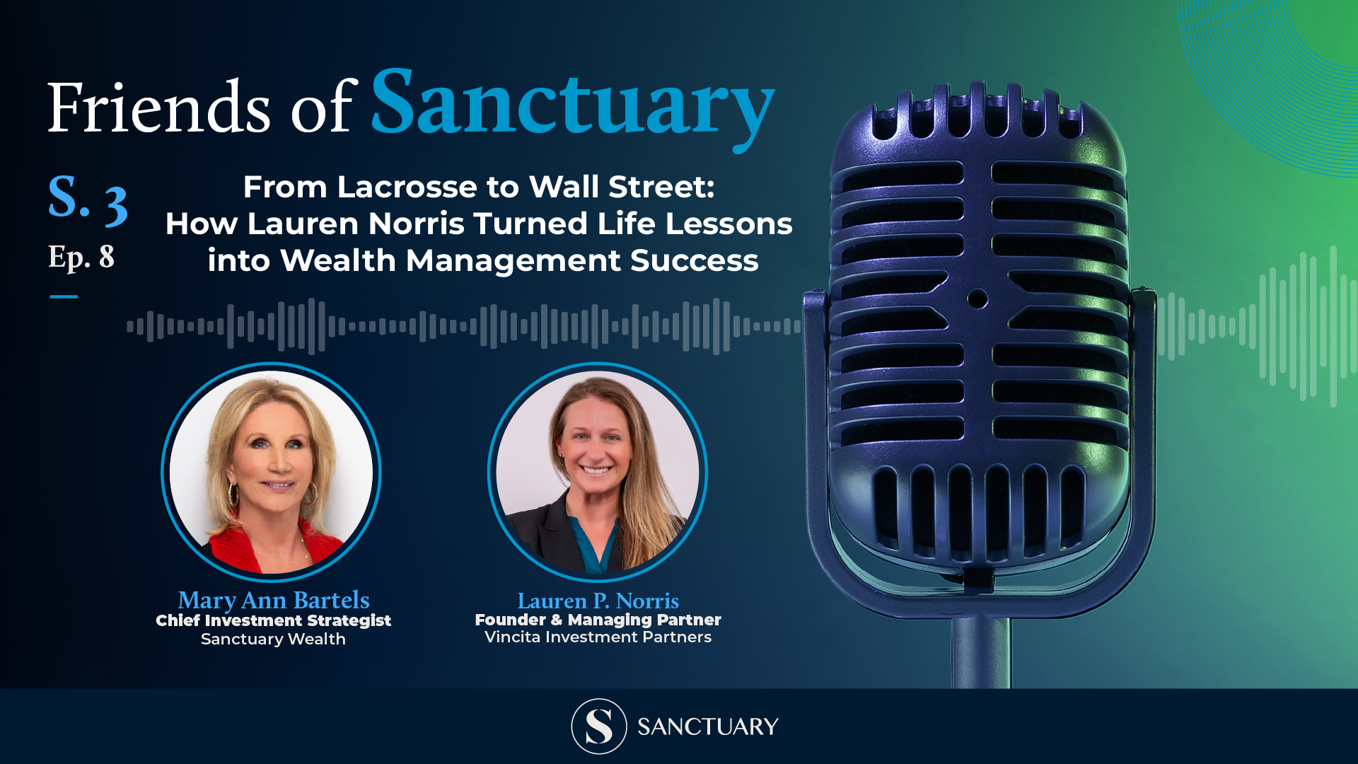 In the latest episode of the Friends of Sanctuary podcast, Santuary Wealth Chief Investment Strategist Mary Ann Bartels joins Lauren Norris, CFP®, CPFA™, Founder and Managing Partner at Vincita Investment Partners, to discuss the challenges and triumphs of her journey from college lacrosse player and coach, to Chair of the Israeli National Team, and now to a successful career as an independent financial advisor.